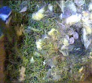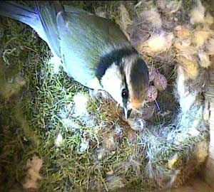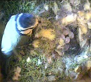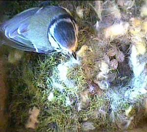 Now she's inside the nest box and is collecting more nesting material to remove.