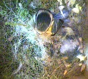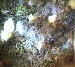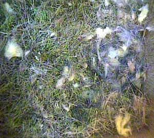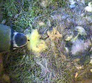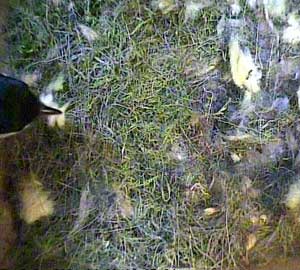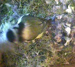 Having removed most of the fluffy stuff, Lucy now appears to be removing some of the grassy material.