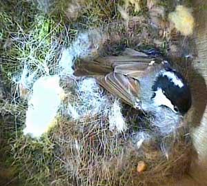 Nine minutes later she removes another large load. I wonder what she is doing with it. Is she just dropping it outside the nest box, or is she taking it to where she is building another nest?
