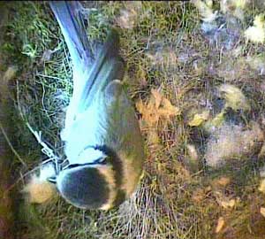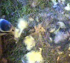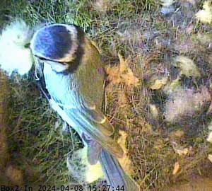 It is now about 3pm and a bluetit is poking its head into Box2. We haven't seen Lucy or Leo for some time and I have forgotten all about them. But this is definitely a bluetit at the entrance and the most likely bluetit to come to this box is Lucy. After all, she brought much of the nesting material into the box and probably still thinks it is her box!