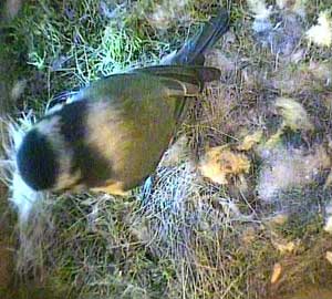 She has now removed all the easy stuff she can reach from the entrance hole, so now she goes into the nest box to collect and remove some more nesting material.