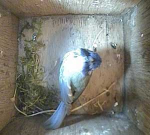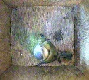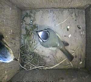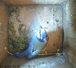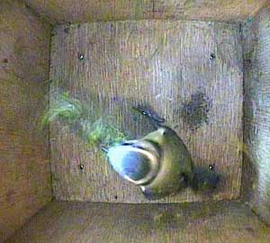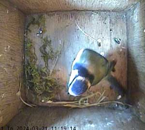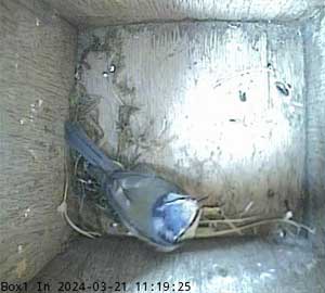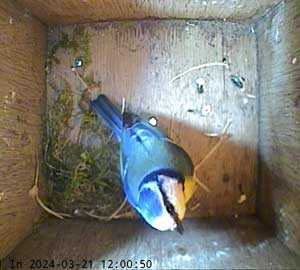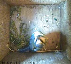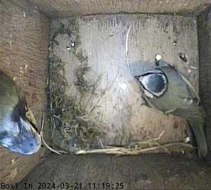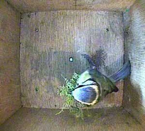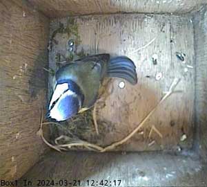At last, a bluetit is bringing nesting material into Box2 Let's call her Lucy and her partner Leo.