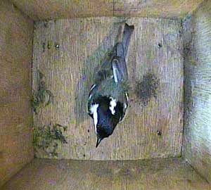A quarter of an hour later still, Keith's patience is rewarded. But is it Scruffy who enters the nest box?