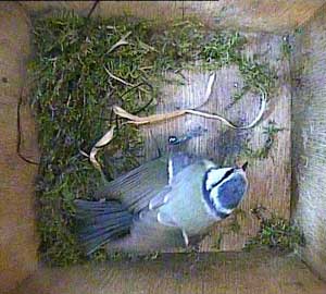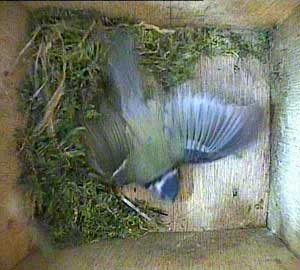 Lucy is slowly but steadily bringing nesting material into her nest box.