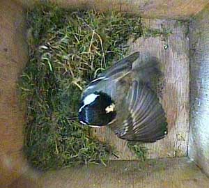 What's this - the coal tit is back again! Surely, if this coal tit is serious, there will be a fight about ownership - and surely an existing bluetit owner will prevail.