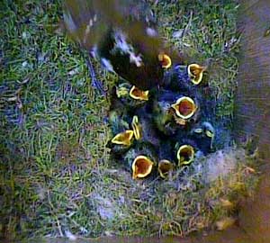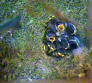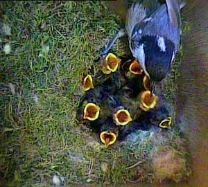 One of the chicks has clearly just been fed, but they all look pretty contented so they must be getting fed often.