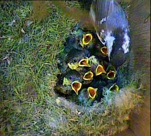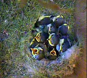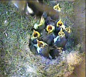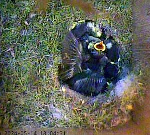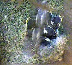 The chicks are recognisably coal tit chicks now. You can see their black heads with the white stripe down the back of their heads.