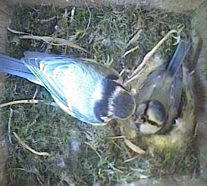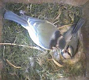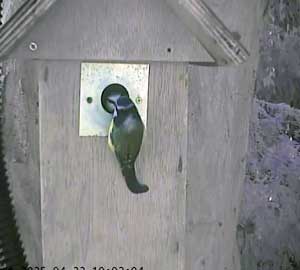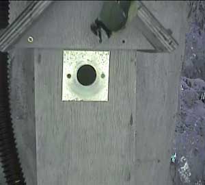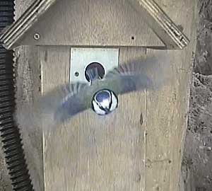 What's about to happen here? You can just see Meg through the hole in the nest box just as Max is coming with another feed.