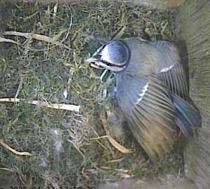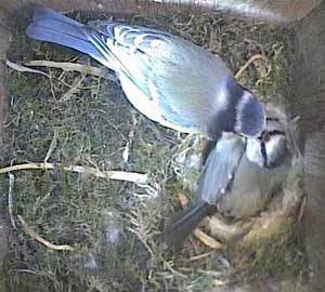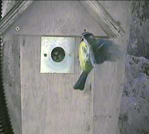 This looks like another bluetit - clearly not Max, though I'm not sure how she can tell. Presumably Max makes a call approaching the box and a foreign bird doesn't. Or perhaps it is just that Max wouldn't land on the roof of the box at this stage.