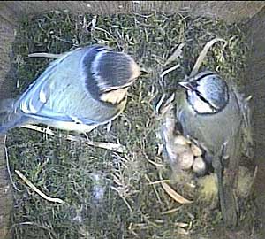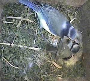 Max giving the food to Meg. It is probably a little green caterpillar as these are the staple diet of the chicks for the first few weeks.