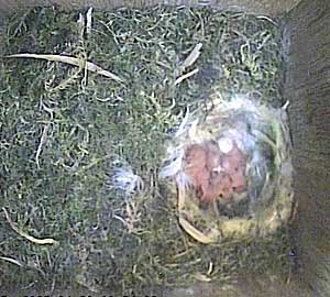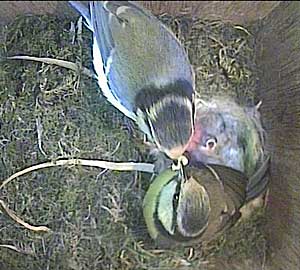 It's shortly before 9 o'clock and Max has brought some food for the chicks. At this stage, the food given to the chicks is nearly always a little green caterpillar. This is the larva of the Winter Moth which lives on oak trees at this time of year and which make excellent food for the chicks.