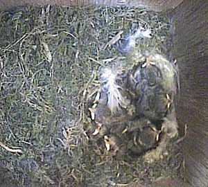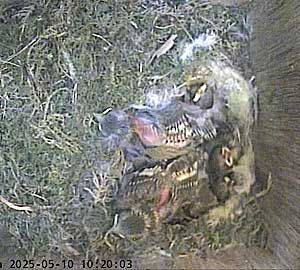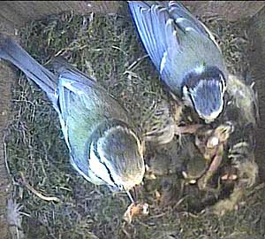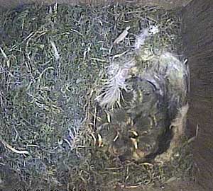 Both parents in the nest box. What on earth has Meg got in her beak?