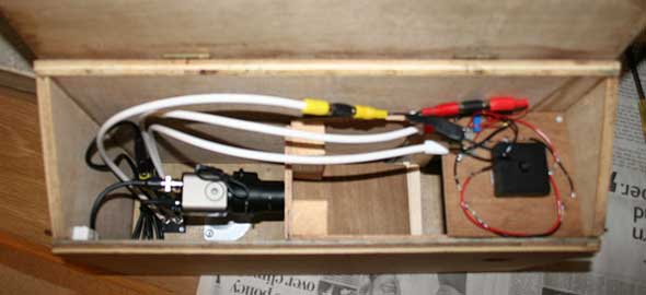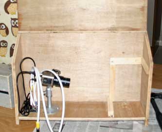 The side view camera, which is a Watec WAT-232 with a zoom lens, is mounted on a small camera stand which is about 4" high and enables the camera to point slightly down to the level at which I anticipate the nest cup will be when the nest has been built. There is a fair amount of guesswork needed here, but we have found that the nest is normally about 1½" to 2½" deep by the time the eggs have hatched out. Not having had an IR sensitive camera before, we have no idea what to expect over night. Probably pictures of sleeping birds!